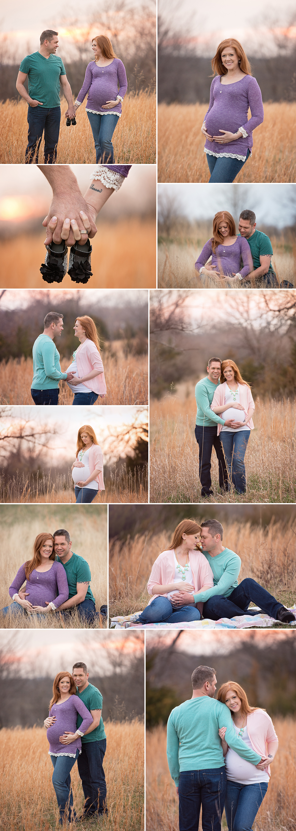 It was so special to photograph the connection between this expecting couple. This was a full session that took place in the Kansas City area in the early spring. I think the jewel tones really worked with the outside setting and the momma-to-be could not have been more lovely. It was fun to have them hold the tiny glittered baby shoes together, showcasing the blessed tattoo on her wrist.