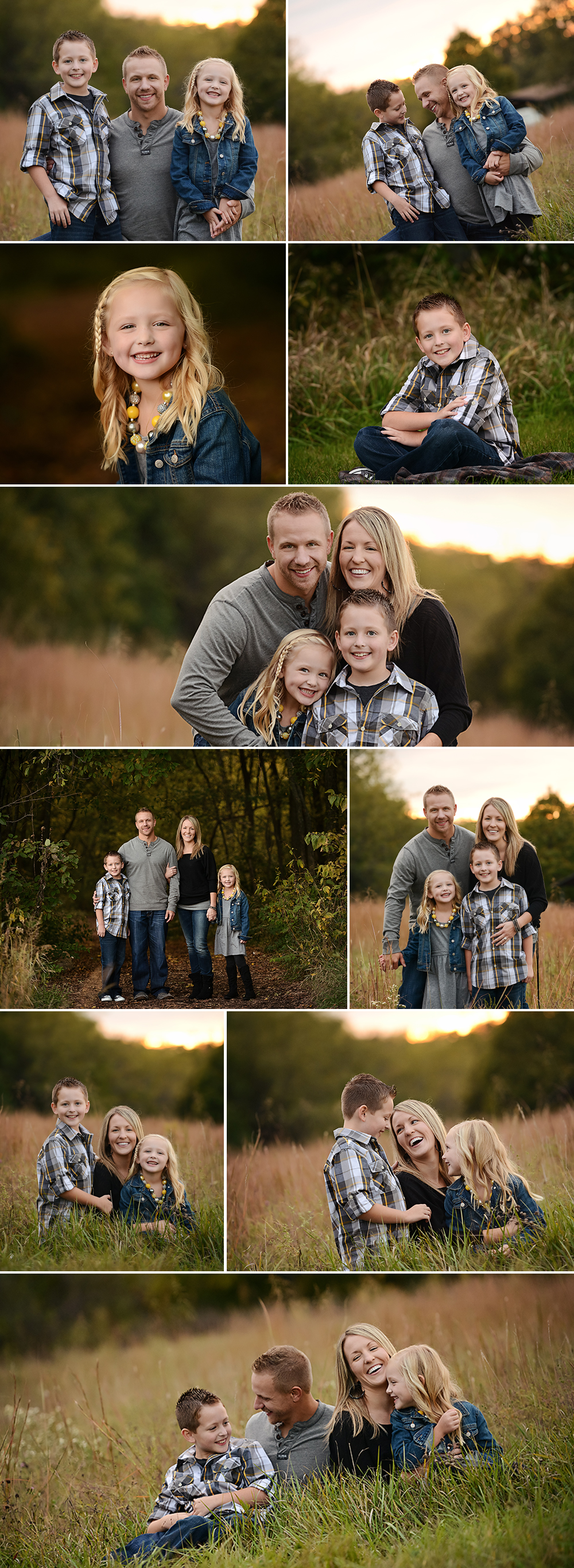 The images of the sister and brother were so heartfelt. I love the sweet smiles and dimples! As the family sits among the golden grasses, the sunlight glistened in the background. It was just the right time of dusk to capture the light.